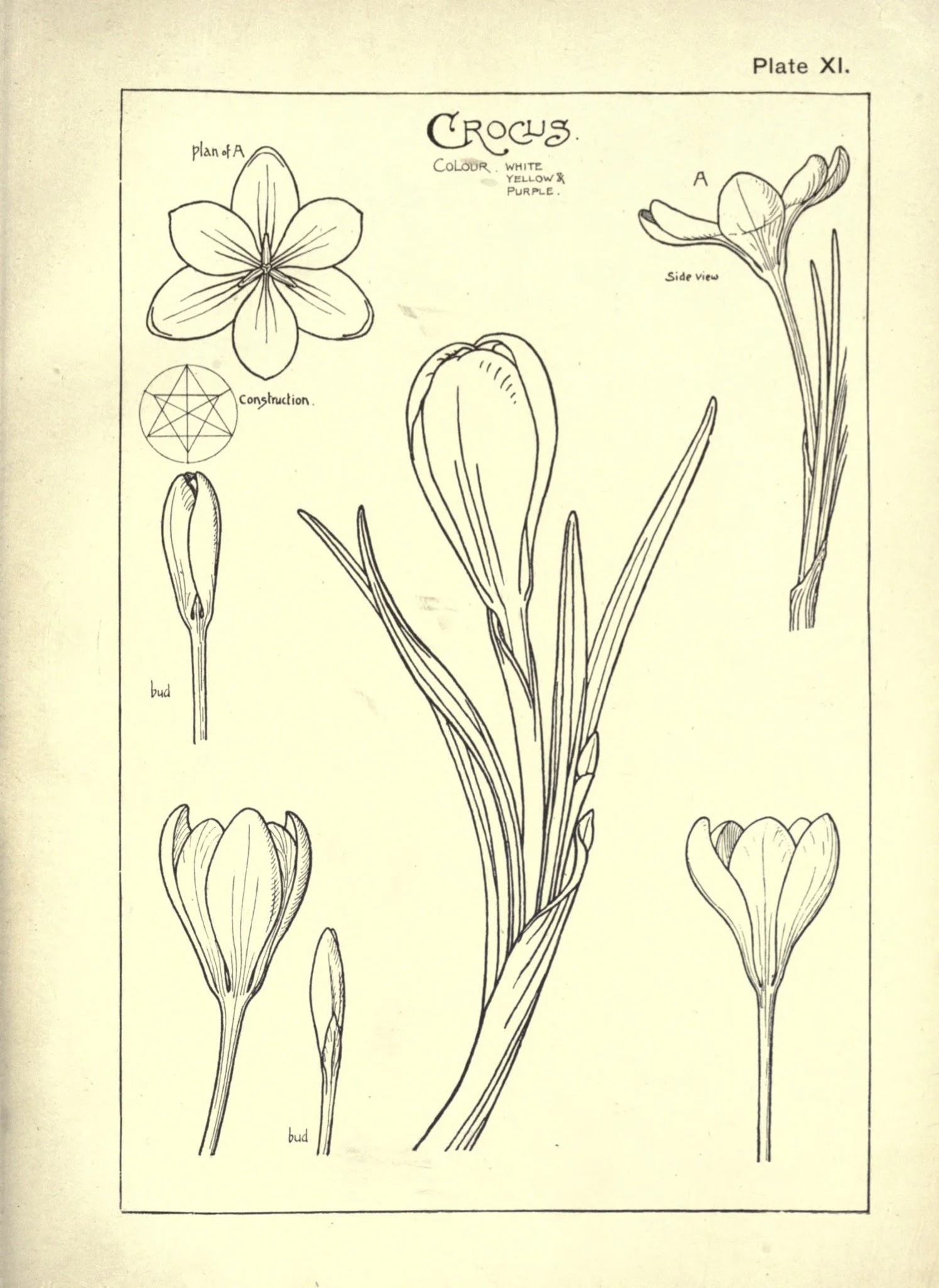 The plate features a naturalistic study of the crocus, with geometrical construction and detailed drawings of its parts from different angles.